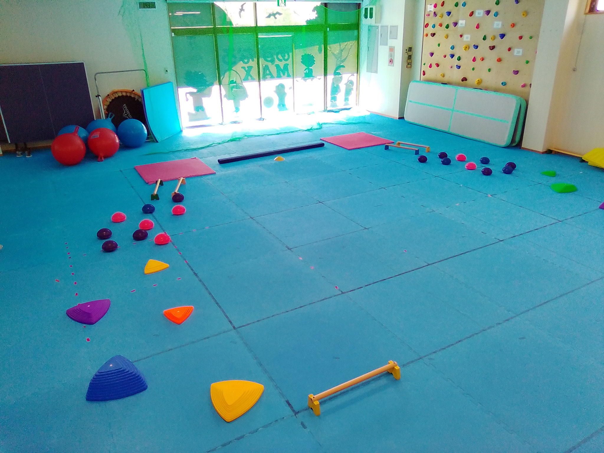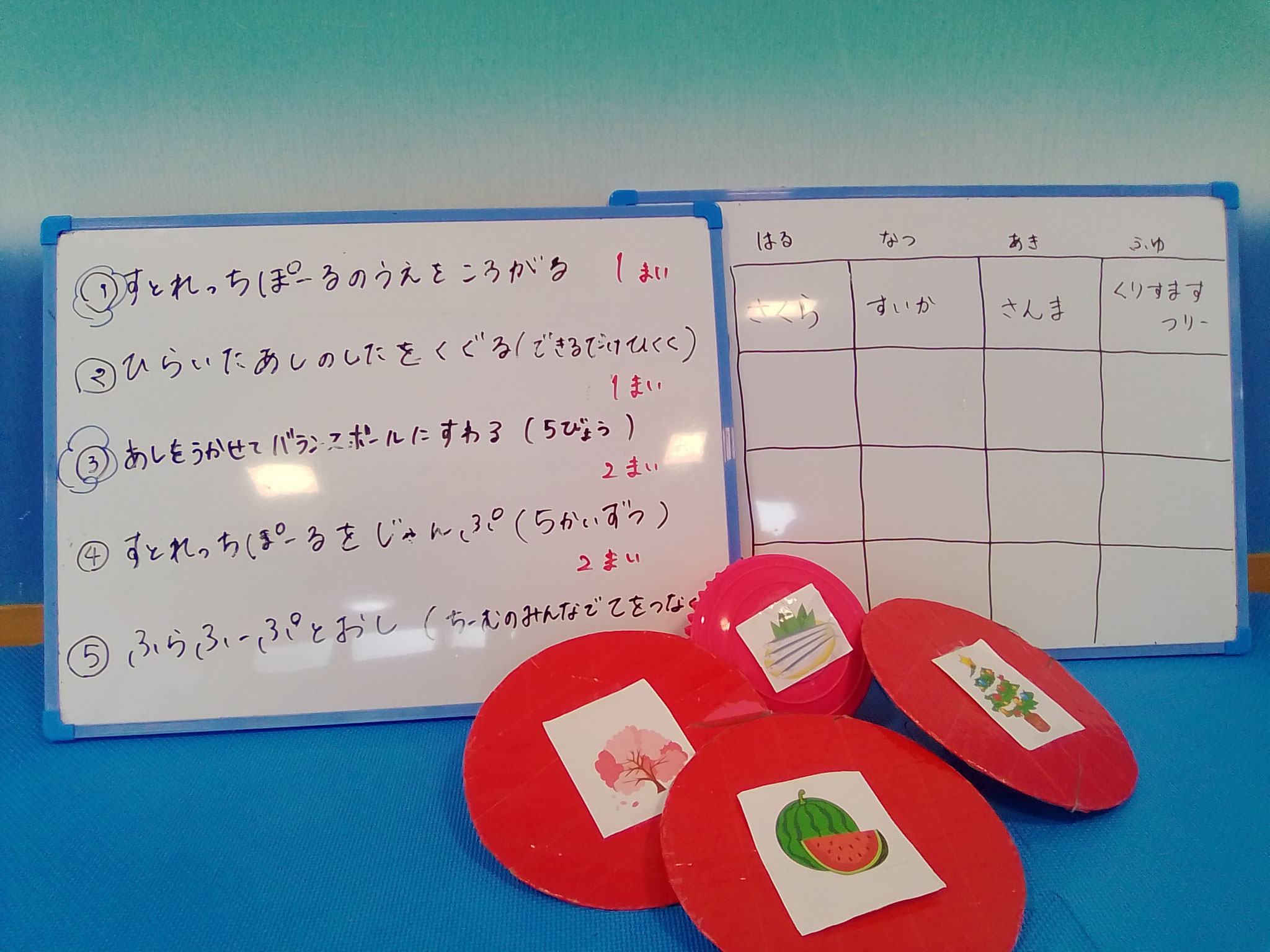 【キャッチ&パス】では、人間関係・社会性を養うことを狙いとして活動しました。このプログラムは3人1チームになり、風船をパスしながら移動し、3か所にぶら下がっているフラフープすべての輪の中に風船を通過させることが出来たら目的達成です! 風船が思うように前に進まず、フラフープの周りでは3人が風船の周辺を行ったり来たり幾度もチャレンジしている様子がありました。 「○○ちゃんそっちでとって!」「○○くんこっちにパスして!!」とパスする側とされる側が懸命に声を掛け合いながら、こどもたちは「バランスストーン・輪っかなどのチェックポイントの上で静止してパスをするというルールをしっかり意識し守りながら、今どこに向かって動いたらよいか、どこにパスをしたらよいか考え動いていました。 そうしてチームで目的を達成しゴールしてくる子どもたちの顔は皆とっても悦ばしく感じられました。